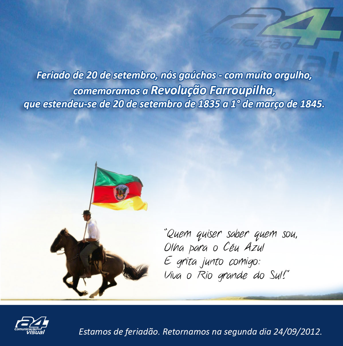 Próximo Revolução Farroupilha (Dia do Gaúcho) 20 de Setembro de 2024 (Sexta-feira) O dia 20 de setembro, conhecido como o Dia do gaúcho, é feriado no estado do Rio Grande do Sul. A data recorda o início a Revolução Farroupilha, ou Guerra dos Farrapos, em 20 de setembro de 1835. Para o Brasil, marca a revolta civil mais longa da sua.