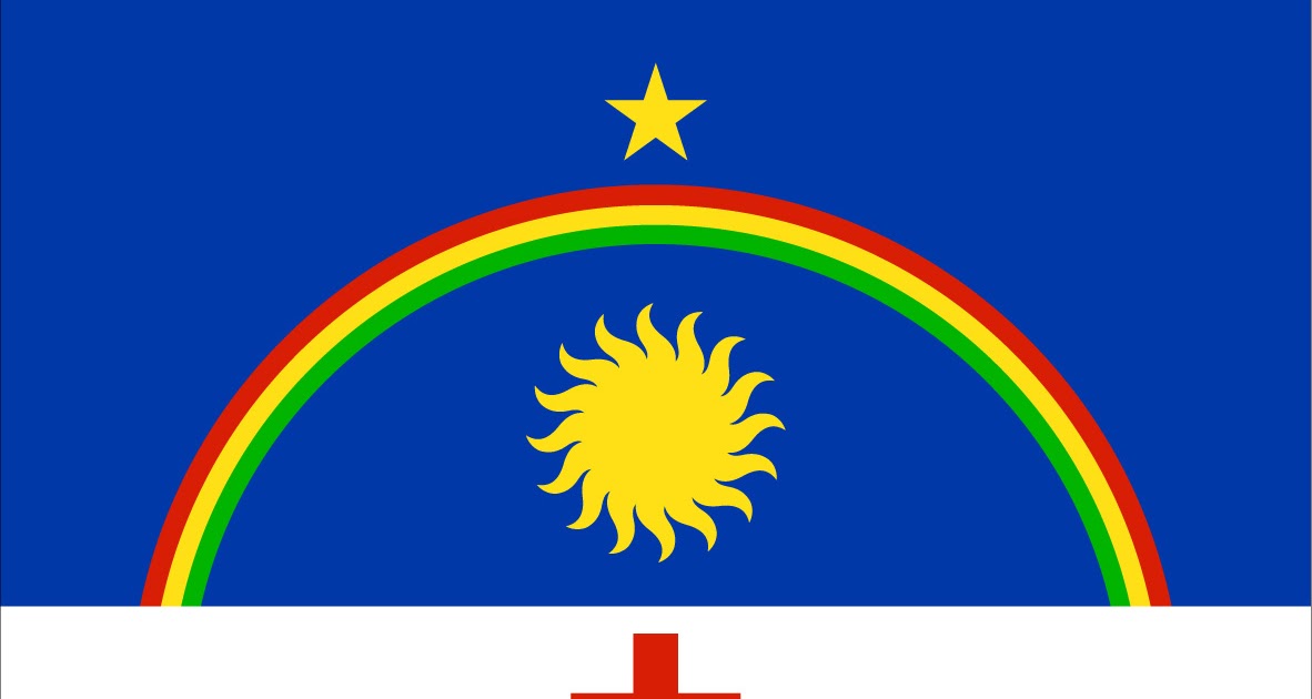 The flag of Pernambuco is one of the official symbols of the Brazilian state of Pernambuco. It is a bicolor pennant, blue and white, with the colors broken horizontally into two unequal sections, with blue in the upper and larger rectangle, the rainbow composed of three colors, red, yellow and green, with a star in above and below the sun, inside the semicircle, both in yellow, and, in the.