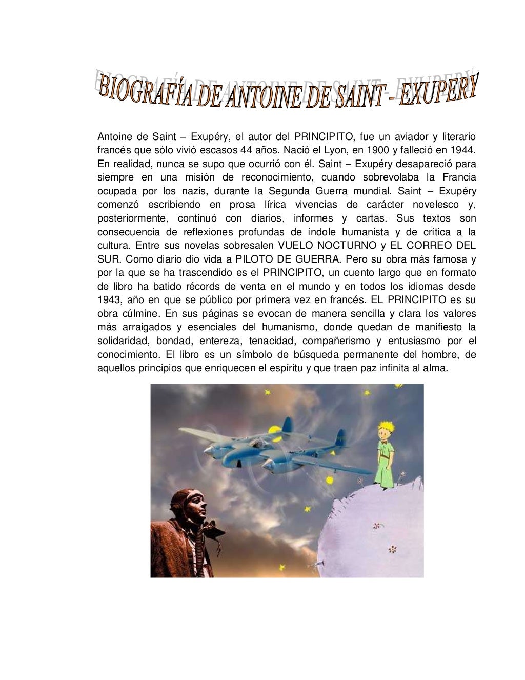 Biografía: Antonie de Saint Exupéry fue un aviador en los tiempos en que la aviación tenía instrumentos insuficientes y pilotear era una ocupación muy difícil y peligrosa, uno de los pioneros de los vuelos postales internacionales. Las experiencias vividas como piloto fueron en algunas ocasiones su fuente de inspiración como escritor. Fue el tercer hijo de de una familia de la aristocracia.