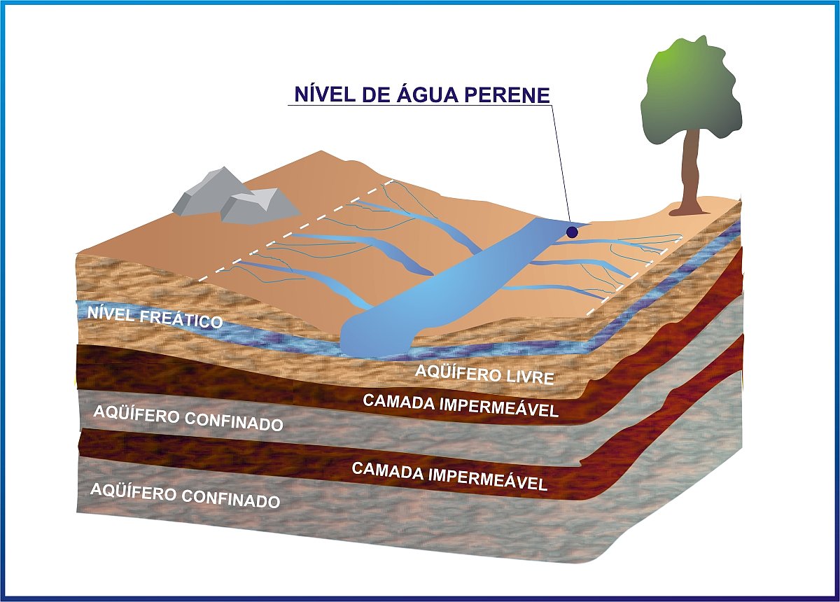 O aquífero livre está geralmente perto da superfície, em vales de rios e a maiores profundidades em altos topográficos. Aquífero confinado ou artesiano - é um aquífero completamente saturado de águas, cujo limite superior (teto) e inferior (piso) são extratos impermeáveis.