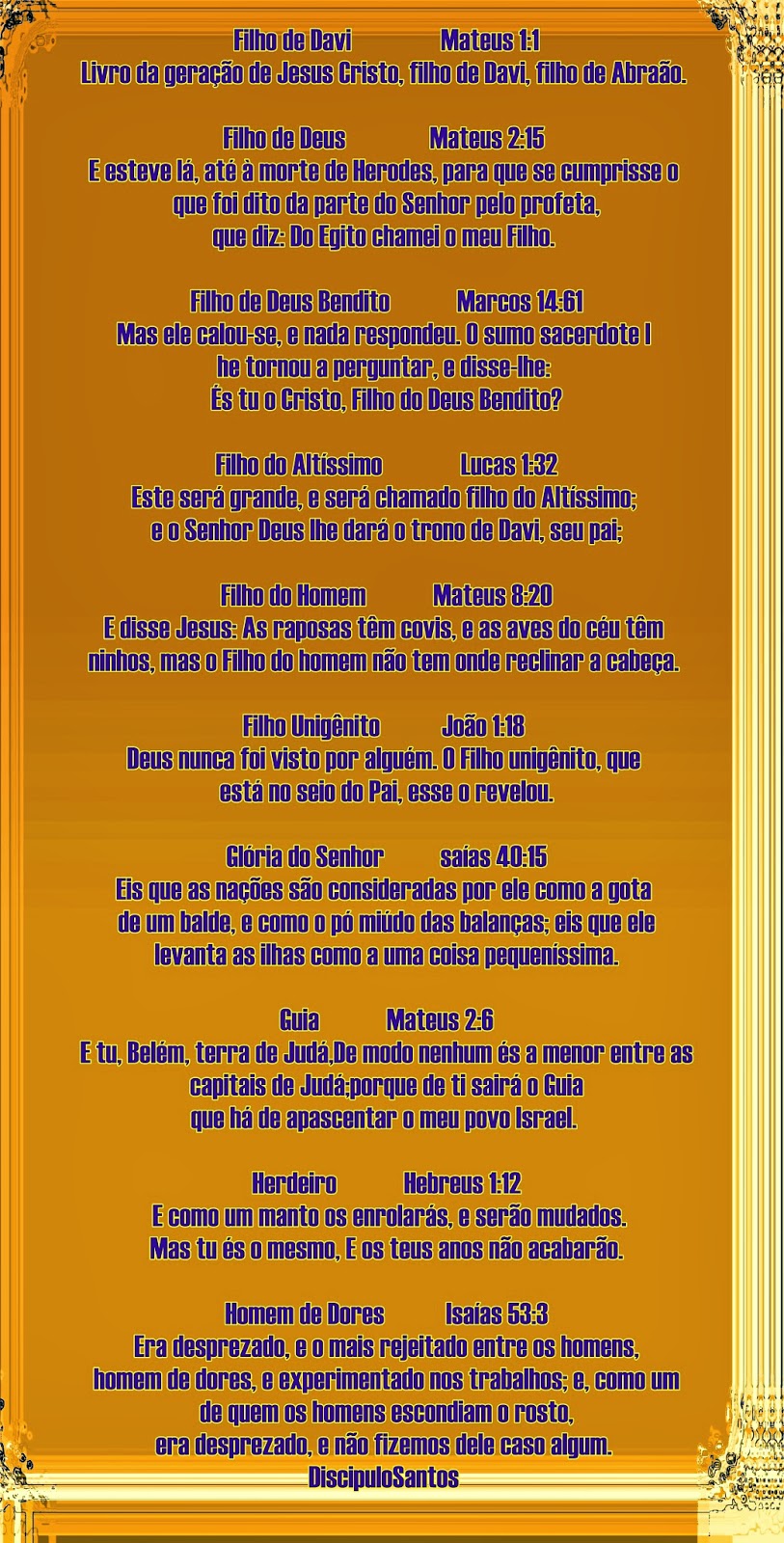 Por toda a Bíblia há muitos nomes referindo-se a Jesus. São todos importantes e revelam algo sobre Ele. Observe os 50 nomes mais usados dados a Jesus, com as respectivas passagens bíblicas, podendo assim ser compreendido um pouco do contexto que o nome é aplicado a Jesus. O Filho do Altíssimo (Lucas 1:32) - Ele será chamado Filho Altíssimo