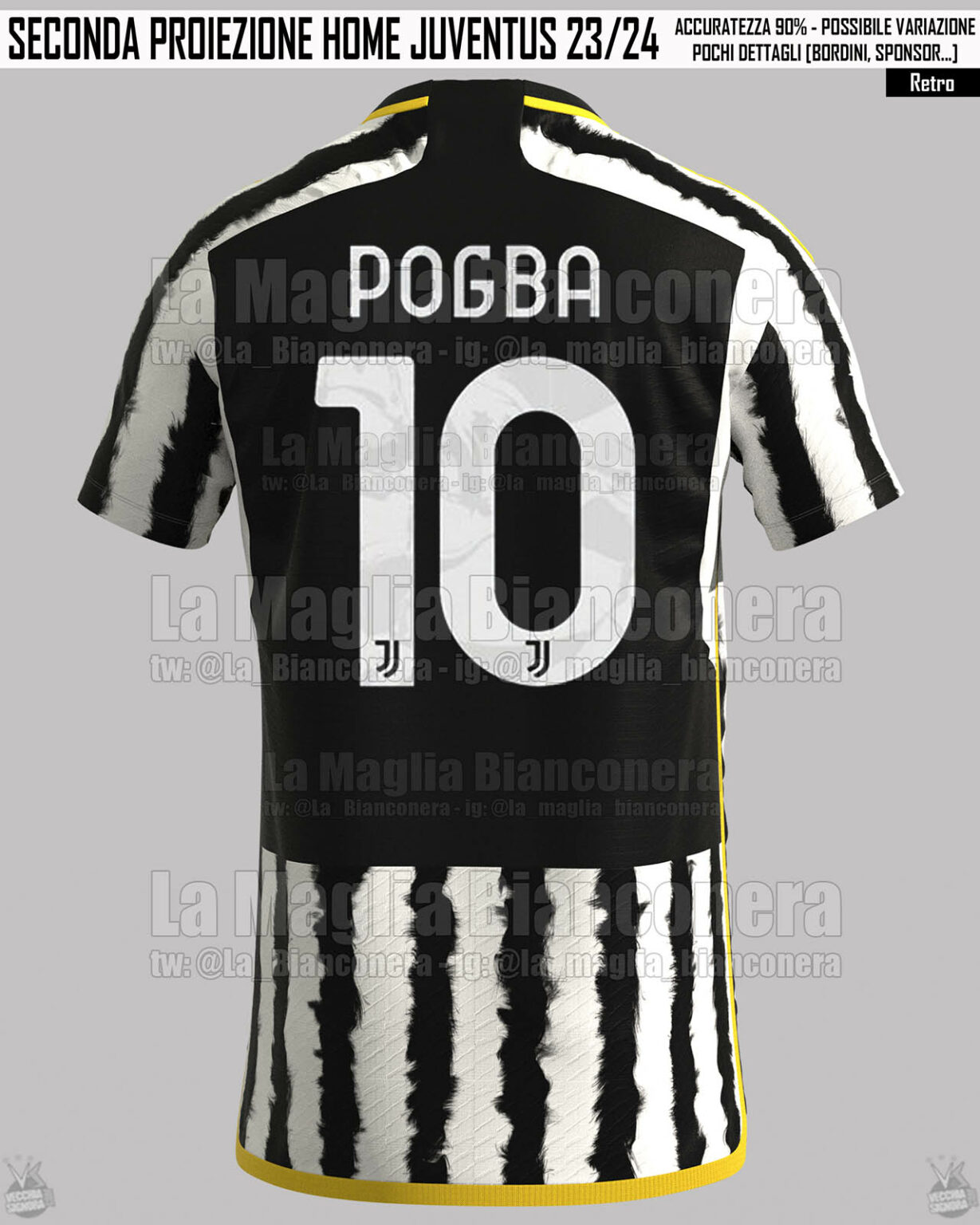 Partindo do desenho, a nova camisa titular da Juventus para 2023-2024 terá suas listras verticais estilizadas para parecer listras de uma zebra, além disso, haverá uma textura de pelos. A gola será preta, enquanto as três listras da Adidas aparecerão na cor amarela, que também será vista no escudo, no logo da Adidas, e em detalhes nas.