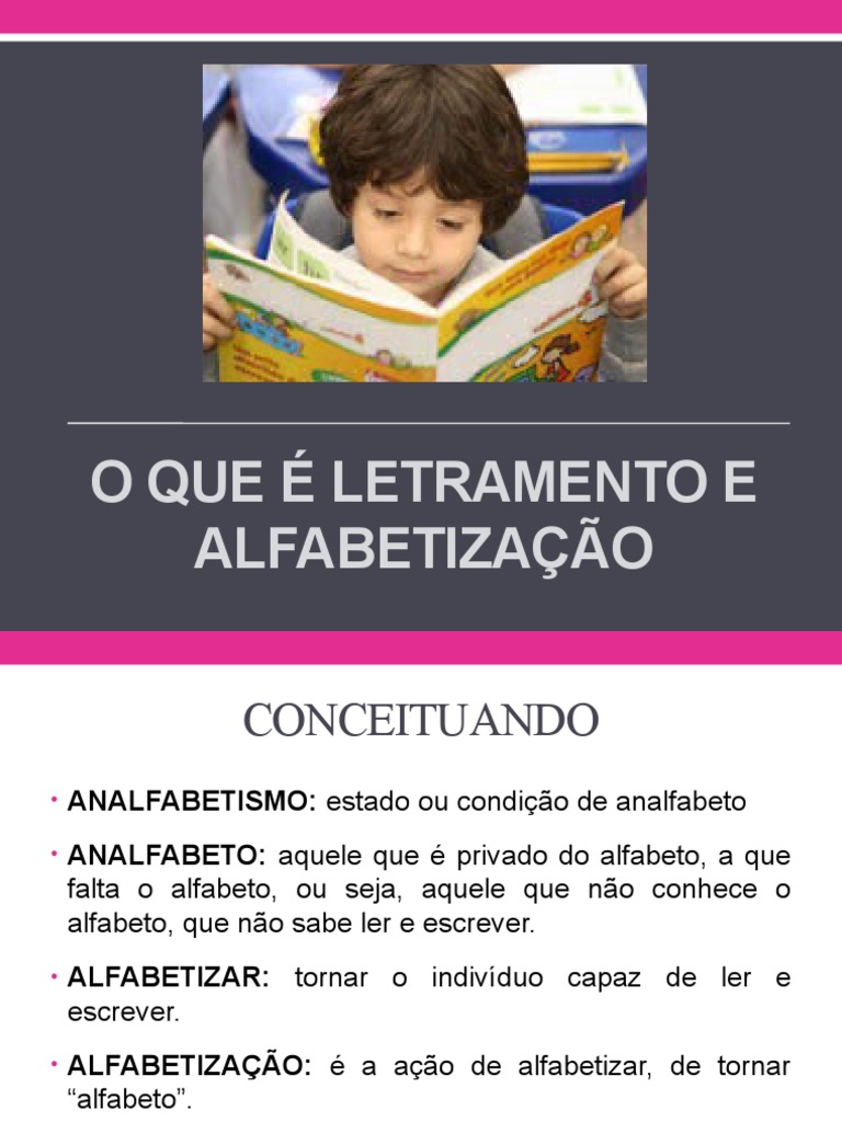 Talvez o mais proeminente seja a diferenciação entre alfabetização e letramento, conceitos que andam juntos quando se trata da aproximação da cultura escrita. Recentemente,. Segundo a professora, o letramento é a aprendizagem acerca do que se faz com esse sistema notacional. Isto é, refere-se aos usos sociais da escrita, que são.