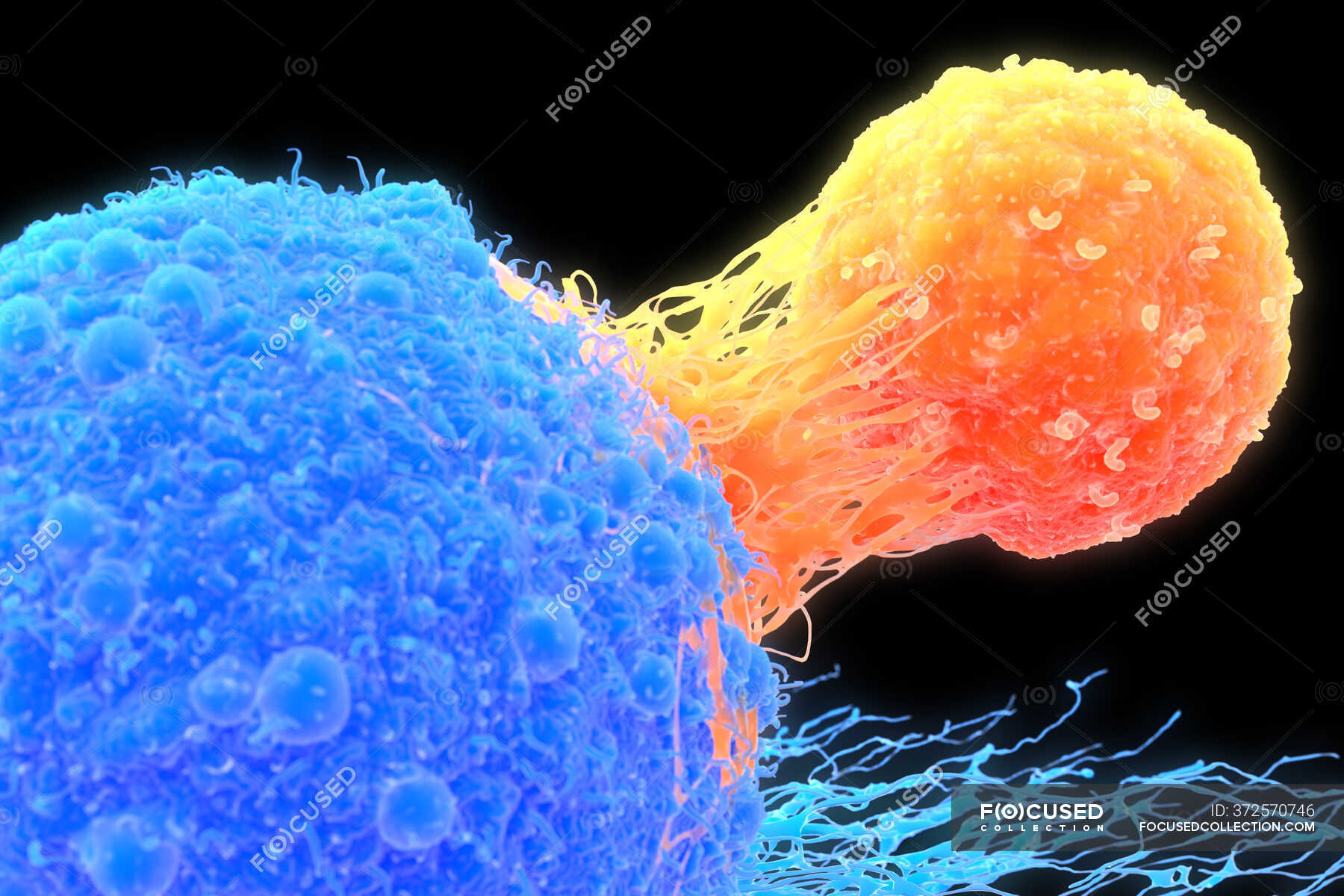 Linfócito T (laranja) ligado a uma célula cancerosa (azul), ilustração. Os linfócitos T são um