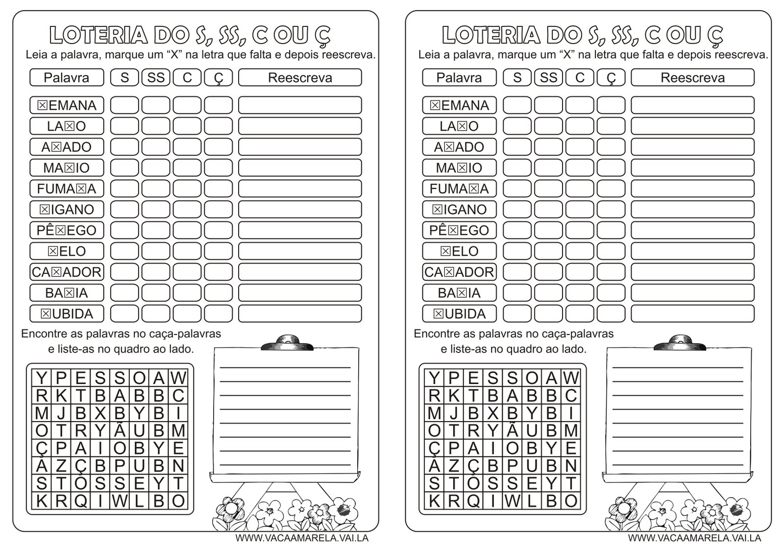 O trabalho com ortografia é atividade permanente na escola. A abordagem proposta aqui pode ser organizada ao longo de todo o ano para as diferentes regras da ortografia, além de S, C, Ç e do SS. Leia sobre o ensino de ortografia no livro Ortografia: Ensinar e Aprender, Artur Gomes de Morais, Ed. Ática. Leia também as orientações acerca.