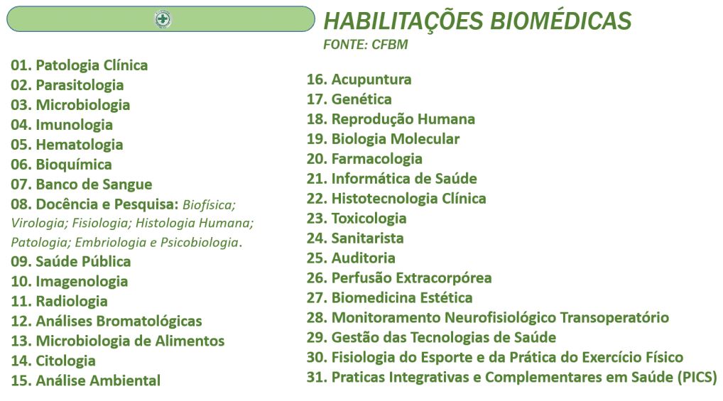 De acordo com o CFM, órgão responsável por mediar a atuação dos biomédicos, existem, ao todo, 38 áreas de atuação disponibilizadas aos profissionais formados em Biomedicina, que englobam desde aplicações estéticas até análises laboratoriais. São elas: Acupuntura. Análise Ambiental. Análises Bromatológicas. Auditoria. Banco de.