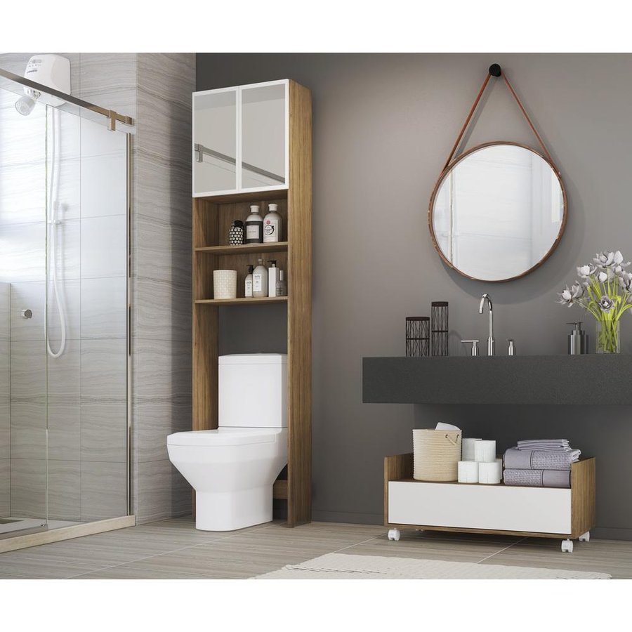 Armário de Banheiro para Vaso Sanitário com Espelho e Balcão com Rodízios Multimóveis Rustic/Branco