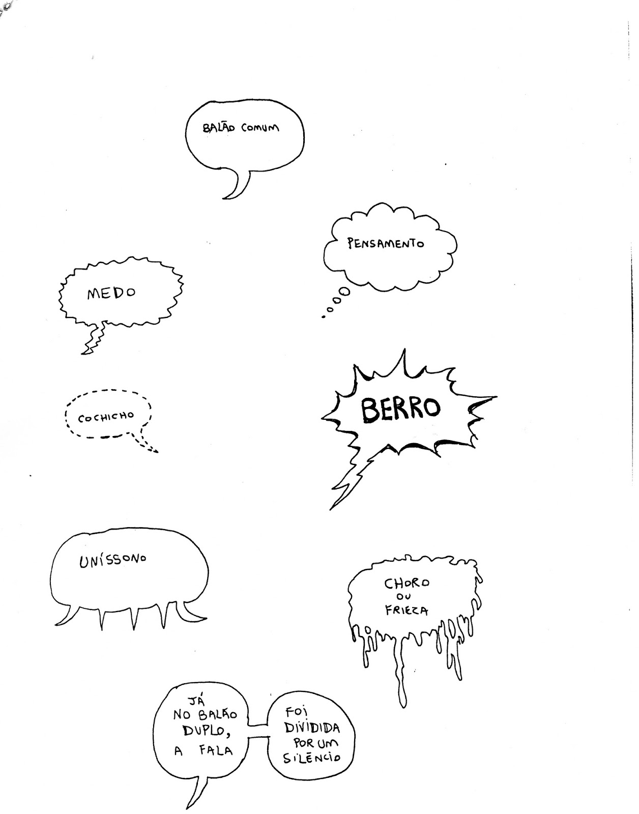 Ex: Cochicho, Grito, Pensamento, Fala, Xingamento, etc. Lembre-se sempre de que os balões que representam essas situações podem apresentar contornos variados e até não ter contorno algum. Materiais complementares: Saiba mais sobre os balões mais comuns nas histórias em quadrinhos, clicando aqui.